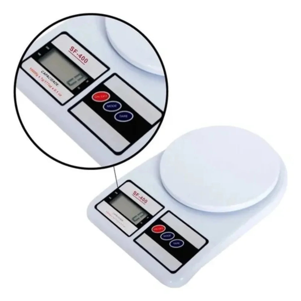 Balança eletrônica de cozinha com capacidade para 10 kg, ideal para suas receitas, prática e fácil de usar.